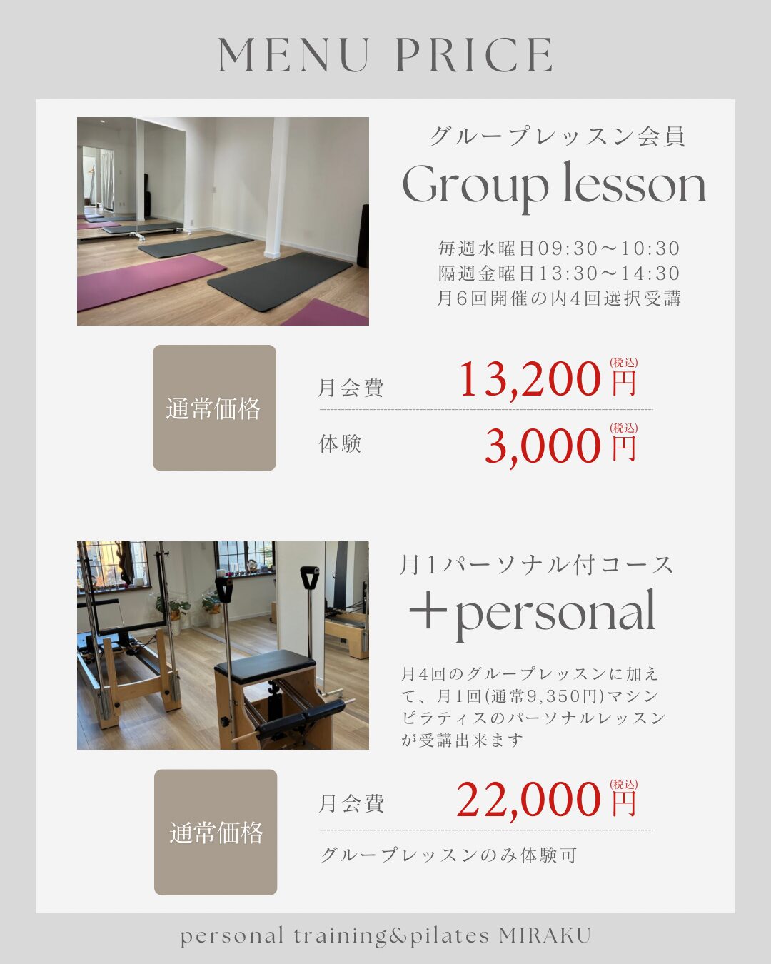 グループ+月1パーソナル会員 22,000円/月 月謝制グループレッスン会員 13,200円/月 -